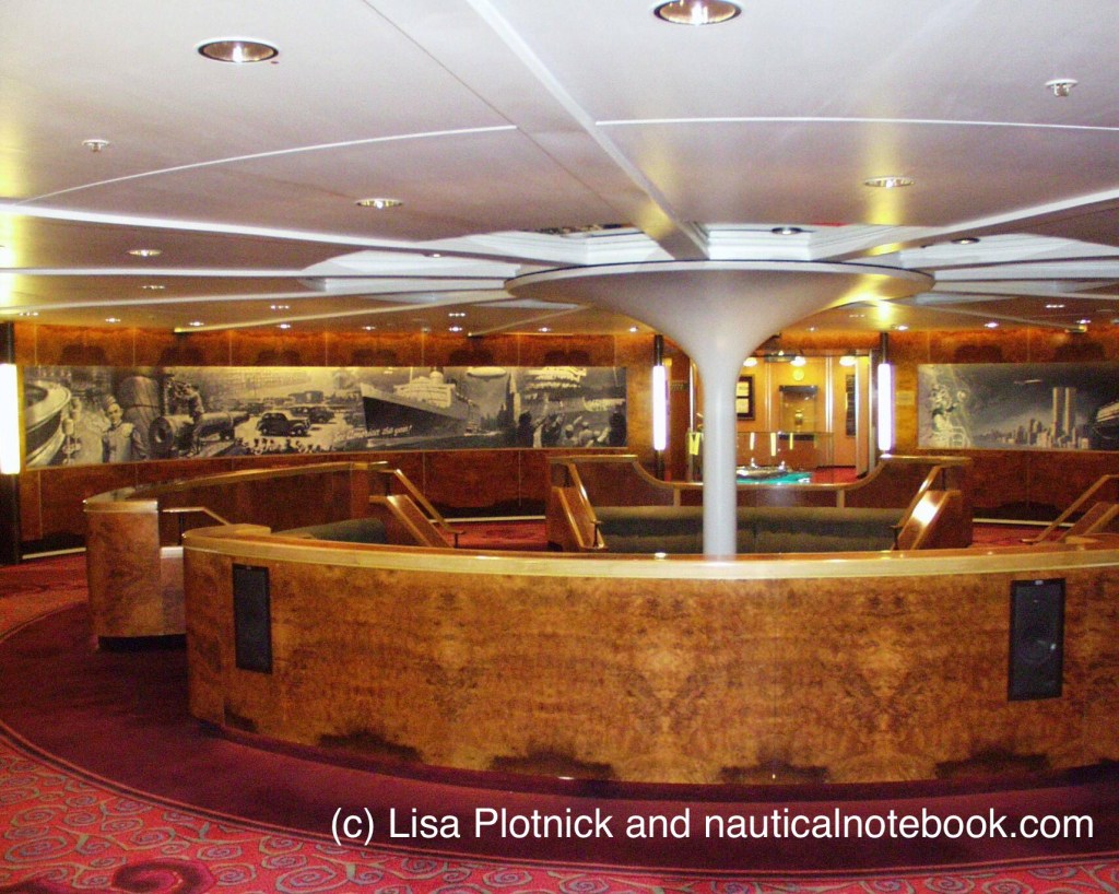 “My first glimpse of QE2 was amidships on Deck 2, near the old photos in the circular reception area. First, though, while boarding, I touched the outside of the ship, something I’ve done on all of our recent cruises—and, now, a crossing.”